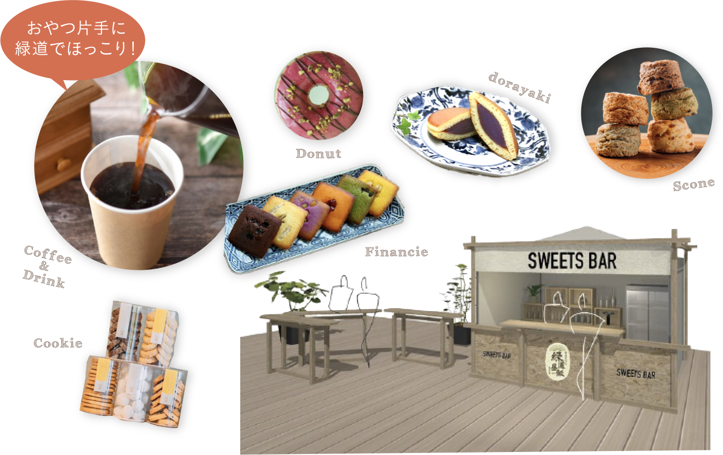 コーヒーやソフトドリンク、各種スイーツを販売します。