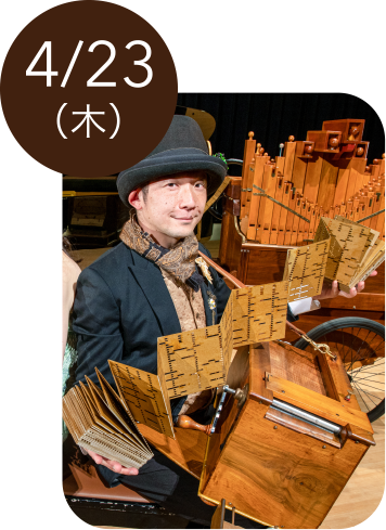 プロの手回しオルガン奏者として、日本全国の各種イベントや、幼稚園、小中高の芸術鑑賞会などで演奏を活動を行う。 自身で製作したキー式27音タイプの手回しオルガン「くるくるオルガン」を愛用。